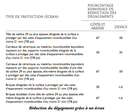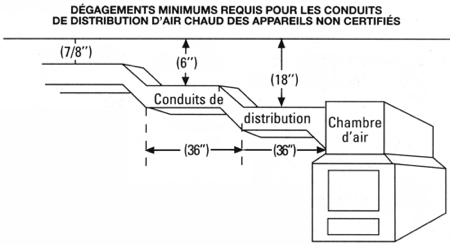 Les six (6) premiers pieds des conduites de chauffage, à partir de la fournaise au bois, doivent être changés pour des conduits isolés spécialement conçus pour ce type de chauffage. Sinon, les espaces de dégagement suivants doivent être respectés :.