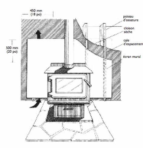 Le dégagement requis pour les poêles à bois se mesure comme suit